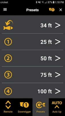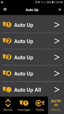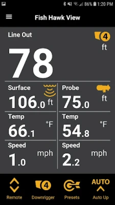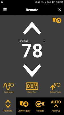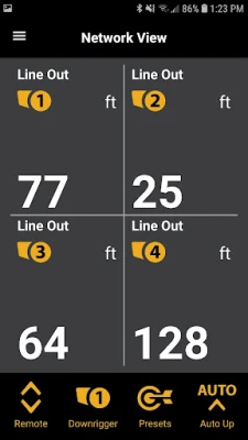 - Access to all your critical trolling data from up to four Optimum downriggers. - See the line out of each downrigger in the network view. - Full control of all networked Optimum downriggers including Auto Up All which will retrieve all your weights at once or Auto Up for just one at a time. - Full remote control including Cycle Mode, Waterline Zero, and Bottom Tracking. - Control of up and down speeds as well as line on spool, line type and line strength for each downrigger. - Access to important software updates and the ability to push software updates right from the app. - Multiple view options