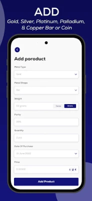 • Enter details like weight, purchase price, and type (bar, coin, etc.)