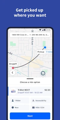 Requesting a ride on NEXT is easy — here's how it works: Tell us where you want to go The app uses your location and matches you with a friendly NEXT driver who knows where to pick you up Pay the regular TriMet fare on board using your Hop card, phone or contactless credit/debit card After you ride, you may be asked to rate your experience